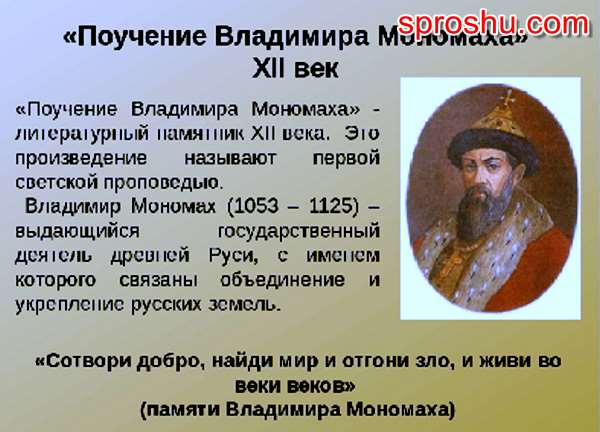 • Речь в вопросе идет о Первом произведении Владимира Мономаха, которое является литературным памятником XII века. Книга (или рукопись) называется «Поучение Владимира Мономаха». В некоторых источниках название книги трактуют так – «Завещание Владимира Мономаха детям», «Поучение детям».