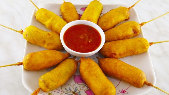 Еще можно сделать сосиски в кляре на палочке. Для этого подойдут бамбуковые палочки, которые тоже продаются свободно. Насадить сосиски на палочки. Если сосиски длинные, то нарезать их пополам или на несколько кусочков. Сделать кляр из 1 яйца, 100 мл молока, 1,5 ст.ложки сахара, соли по вкусу, 1 ч.л. разрыхлителя, 200 гр муки. Раскалить подсолнечное масло в глубокой посуде и обмакивая сосиски в кляр, жарить во фритюре до золотистой румяной корочки.