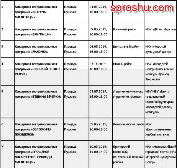 Город Новороссийск уже вовсю отмечает масленичную неделю (04.03. - 10.03.2019) и на Пушкинской площади любой желающий может принять участие в массовом гулянии. Всех желающих ждёт праздничная программа, скоморохи, шутки, конкурсы, концерт и даже есть возможность не только отведать блинов, но и самому принять участие в их изготовлении прямо на улице.