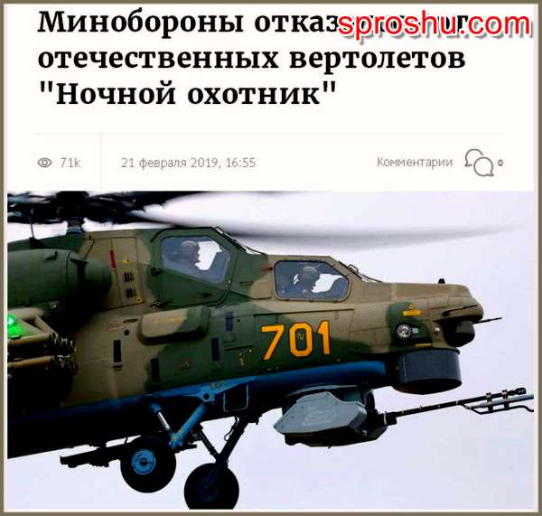 Я полагаю - основной причиной отказа Министерства Обороны России от закупки вертолётов "Ночной охотник" - их дороговизна по сравнению с нашими же аналогами. Видимо, эту боевую. машину и готовили на экспорт. Сам по себе вертолёт очень хороший, но, видимо, его будут закупать страны, где денег девать некуда. Например - ОАЭ, Саудовская Аравия, Катар и прочие. Американцы прикупят, для изучения и что-нибудь скоммуниздить. Но они прикупят уже через тех же саудов. Это моё личное мнение.