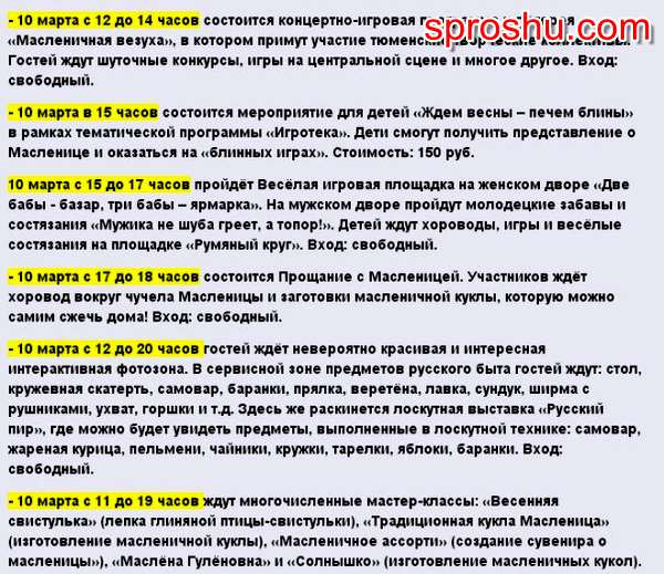 Про концертную программу, конкурсы и состязания, хороводов и пения, поедание блинов и многого другого - даже говорить не стоит, так как всё это включено в программу мероприятий. Главное событие пройдёт в Ялуторовске и более подробно о проведении этого события - читайте здесь.