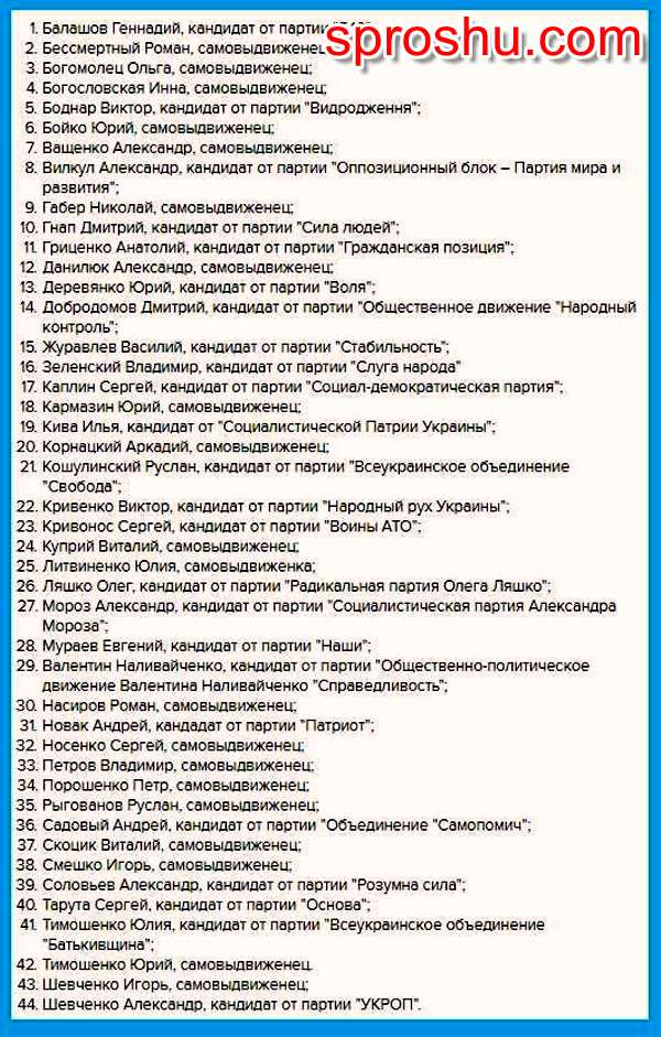 44 кандидата в президенты на этих выборах 2019 года - больше уже не будет, так как регистрация завершена. Меньше ещё может стать, если кто-то из предвыборной гонки выбудет. Ниже на скрине список кандидатов полностью на данный момент. Список огромны и рекордный (предыдущйи рекорд 24 кандидата в 2004 году) - в списке даже дважды повторяются фамилии Шевченко, а кандидаты с фамилией Тимошенко совпадают не только фамилиями, но и инициалами: Тимошенко Юлия Владимировна и Тимошенко Юрий Владимирович.