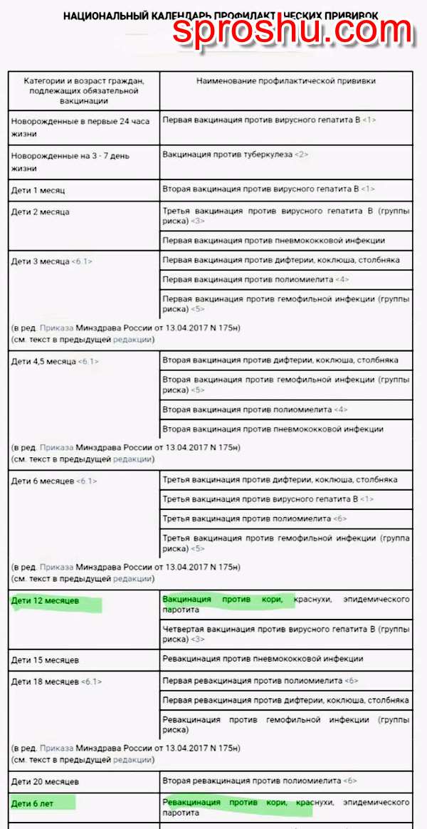 Прививка от кори делается дважды, согласно национальному календарю, Приказ Минздрава 125н, в один год и в шесть лет