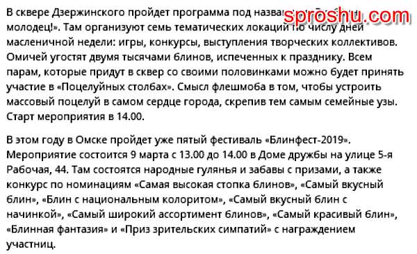 В городе Омск так же будет праздноваться сей день (10.03.2019) во многих местах и если взглянуть на карту мероприятий то конечно же - главные мероприятия пройдут на Любинском проспекте и сквере имени Дзержинского и начнутся в 12:00, а будут закончены в 16:00 сожжением чучела уходящей зимы. Подробнее об местах празднования этого светлого праздника, месте и времени проведения - читайте тут или здесь.