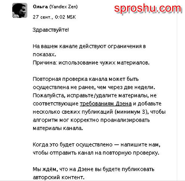 Письмо которое я однажды получил от администрации Яндекс Дзен: