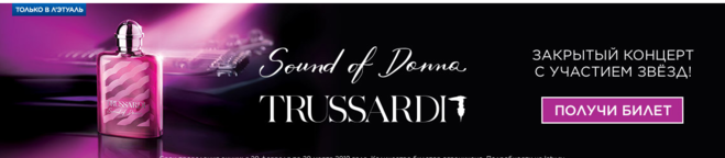 Также есть акция под названием "Trussardi Sound of Donna", так купив один аромат от "Труссарди" можно принять участие в розыгрыше билетов на концерт.
