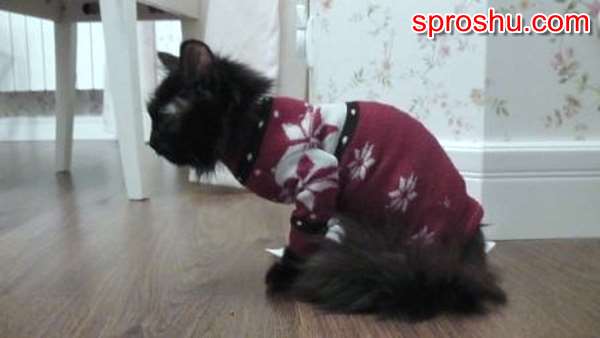 Делала для котенка-подростка. Носок нужен большого размера и хорошо тянущийся. Просто приложите носок вдоль тела животного и заметьте, где, примерно, нужны прорези для лапок. Сделайте разрезы в намеченных местах: для передних лапок длиной 3-4 см, для задних - 5-7 см. Все размеры индивидуальны, примерьте и прорежьте еще, если нужно. Рукава, как на моем фото, можно вырезать из второго носка, а можно и без рукавов. Для рукавов отрежьте "голенище" носка от нижней части, приложите к лапкам и отметьте длину. А затем просто сшейте вдоль каждый рукав. Вшейте рукава в разрезы. На моем фото рукава только на передних лапках, а свитерок заканчивается перед задними лапками.