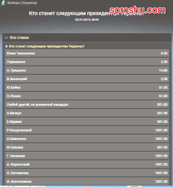 Сегодня пятое марта 2019 года, до выборов президента Украины 26 дней и ставки у букмекеров такие -