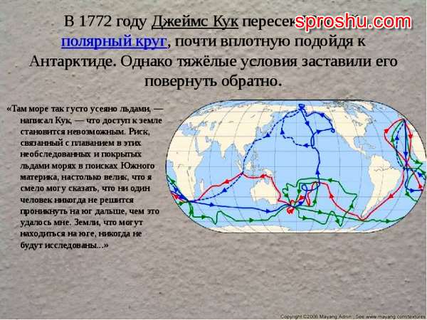 Мореплаватель Джемс Кук исследовал моря и открывал новые земли и во время второго кругосветного путешествия (1772 - 1775 годы) пересек Южный полярный круг, чем стал знаменит и получил признание за всю историю человечества.