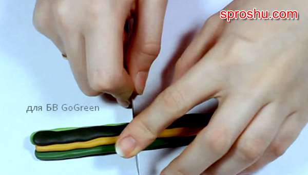Для этого скатываем 4-5 цветов (зеленый. охристый, травяной, черный, коричневый) сначала в шарики, затем делаем из шариков полоски и плотно прижимаем их друг к другу. Уплотним и нарежем тонкими пластинами.