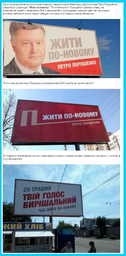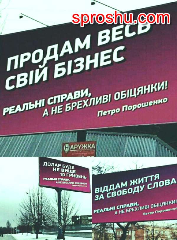 Я уж не говорю о том, что любой живущий в Украине вполне способен вспомнить выборную кампанию Порошенко 2014 и там не было таких слоганов, да и билборды выполнены были в другом совершенно стиле и в другом цвете.