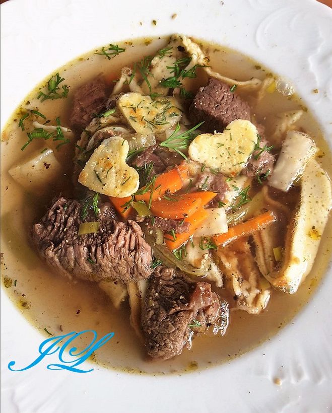 В мой фледлесуппе я кладу и такие "сердечки"-вырезки из блинов. Уже много лет такой супчик (правда, я готовлю его с добавлением вина) открывает мою немецко-русскую масляную неделю.