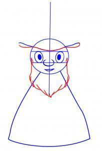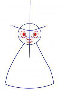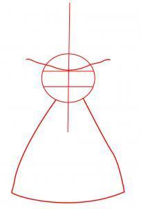 Чтобы его изобразить нарисуем в центре вертикальную линию симметрии, через нее проведем круг, который разделим на три части по вертикали. Сверху покажем нижнюю границу его шляпы. Обозначим очертания его фигуры.