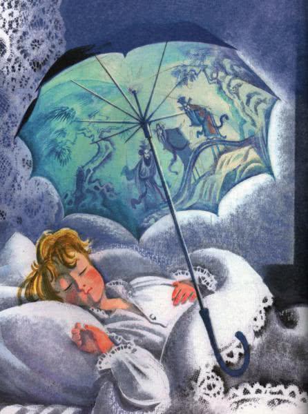 Яльмар видит сны под зонтиком с картинками.