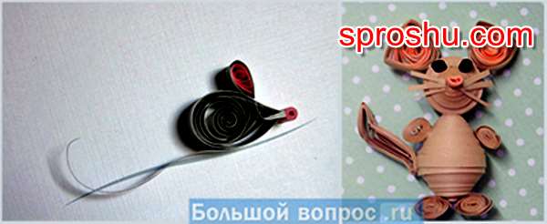Создаем из серой бумаги мордочку мышки, это сделать легко, потому что центр собранной спиральки можно выдвинуть вперед и создать выступающий нос мышки.