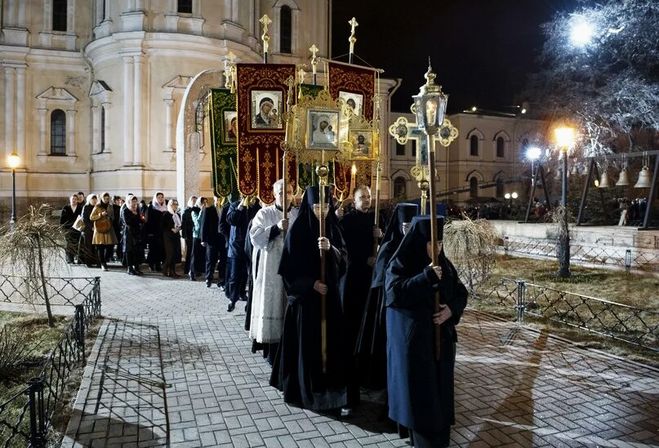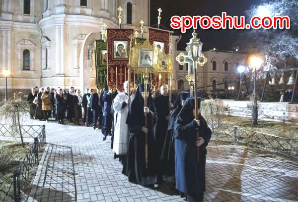 Христиане идут вокруг храма, со свечами в руках, с песнопениями.