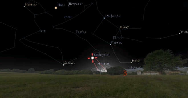 - Меркурий. Виден, начиная с середины месяца на юго-западе низко над горизонтом в созвездиях Водолея и Рыб. Наблюдать можно вечером после захода Солнца.