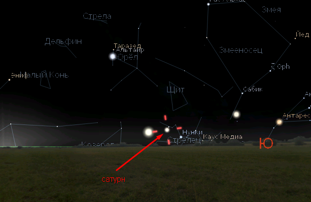 - Сатурн. Виден в течение месяца низко над горизонтом до восхода Солнца в созвездии Стрельца и Щита. В конце месяца Рядом с Луной.
