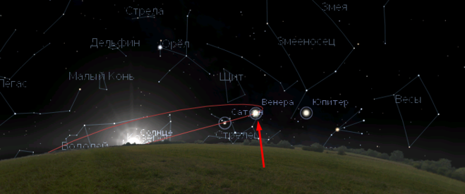 - Венера. Видна рано утром перед восходом Солнца в созвездии Стрельца в начале месяца и постепенно смещается к созвездию Козерога ближе к концу месяца. Венеру и её орбиту см. на схеме: