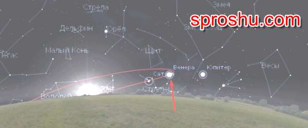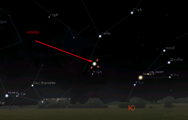- Юпитер. Виден очень низко над горизонтом рано утром перед восходом Солнца. Наблюдается в созвездии Змееносца в южной части неба.