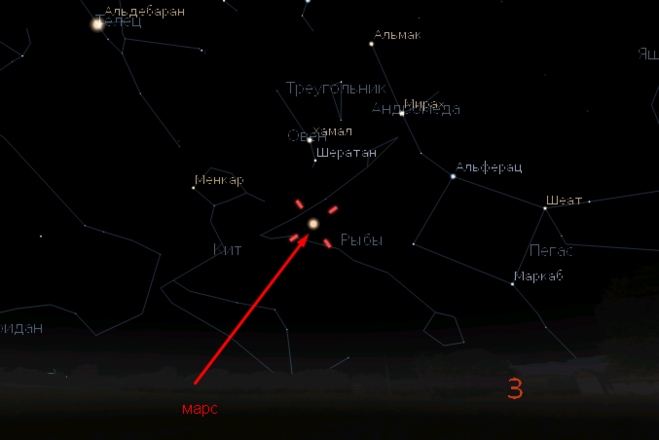 - Марс. Виден в начале месяца в созвездии Рыб после захода Солнца и до полуночи в западной части неба.