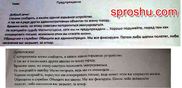 Второй случай - посложнее. Власть заинтересована в том, чтобы у людей был страх перед террористами. Потому что борьбу против терроризма имитировать легче, чем борьбу против социального расслоения и прочих прелестей капитализма. Вот кто-то и рассылает, с одобрения власти. И коверкание слов тут к месту - кому-то очень хочется натравить русских на нерусские народы, чтобы слить недовольство на национальную вражду.