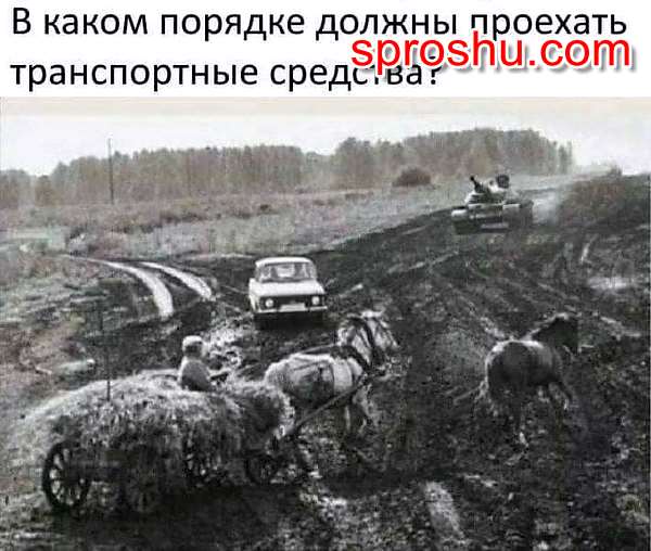 Перекресток равнозначных дорог нерегулируемый. Нас в начале 90х учили, что танки надо пропускать. И вообще лучше от них держаться подальше. Потому что водитель танка видит через триплексы и легковой автомобиль, который будет от танка по правую руку он может не видеть совсем. Поэтому всем стоять и бояться пока проедет танк. Потом гужевая повозка, потом легковой автомобиль (у него помеха справа). Вот такую версию озвучу. Но очень-очень хочется узнать правильную версию!