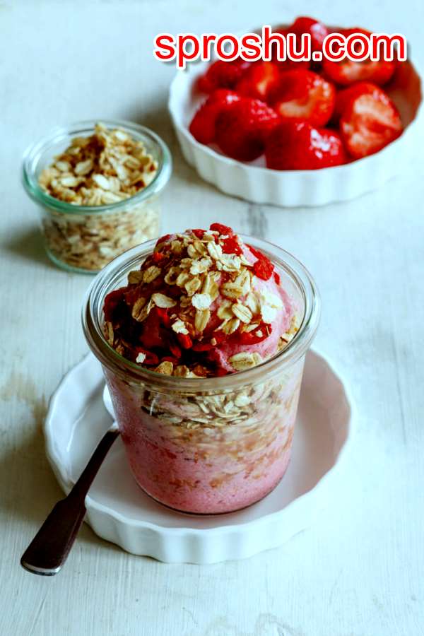 В стеклянную банку 0,4 или 0,5 мл добавляем овсянку, молоко, йогурт, сахар (либо другой подсластитель) и фрукты или ягоды.