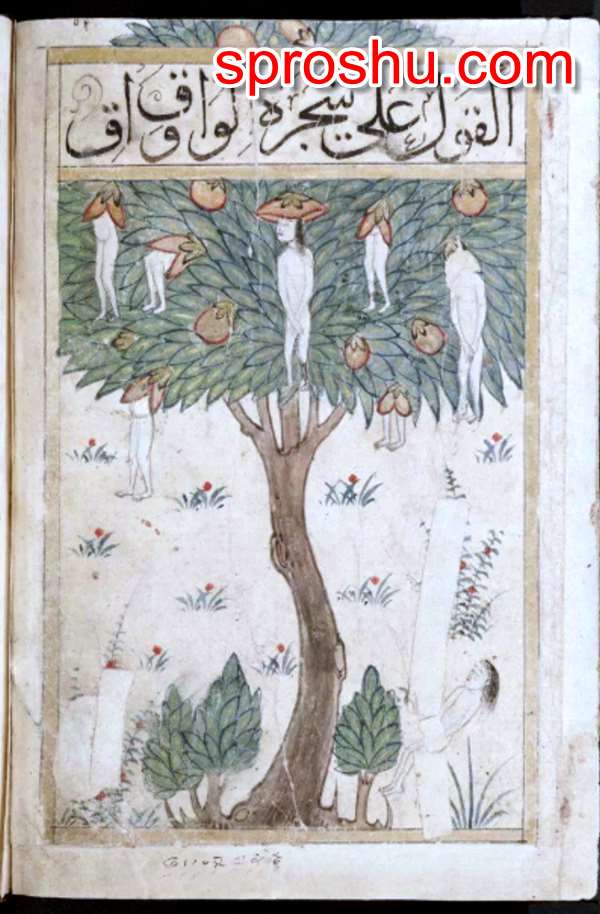 Согласно арабской мифологии на этом дереве были изображены плоды в виде голов человека,