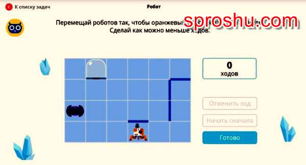 Сначала отправляем оранжевого робота в левый угол