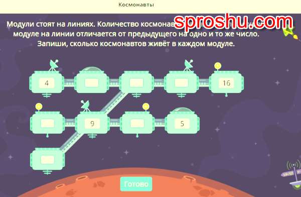 Космонавтов расселили так, что на одной линии, количество человек прибавляется в каждом модуле на одинаковое число.