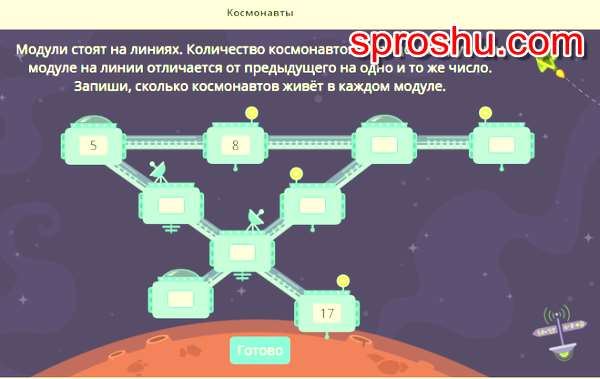 Интересное космическое задание. Здесь надо хорошенько поразмыслить. Сколько же космонавтов находится в разных модулях.