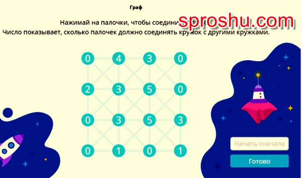 Например из цифры 3 есть возможность начертить только 3 линии, потому что рядом есть кружки с цифрой ноль и туда мы линию не рисуем. Из цифры 4 - можно провести только 4 линии.