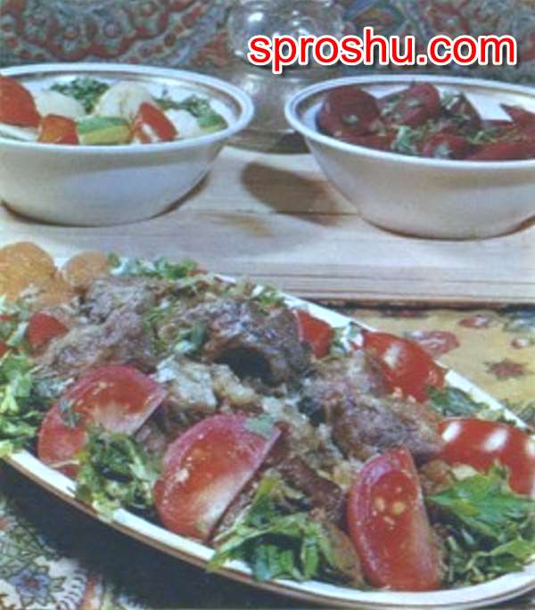 Готовое мясо в собственном соку по-таджикски подадим на стол с овощным салатом. Приятного аппетита!
