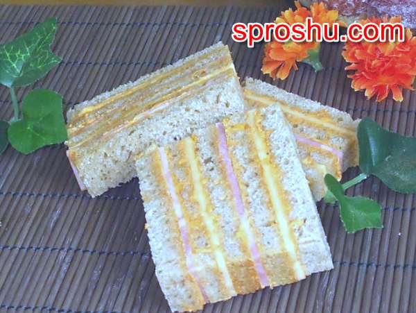С пяти кусочков хлебушка аккуратно срежем все корки. Один кусочек намажем приготовленной смесью, выложим кусок колбасы и накроем смазанным с двух сторон другим куском хлеба. Выложим кусок твёрдого сыра, накроем куском хлебушка и так делаем пока не закончится хлеб.