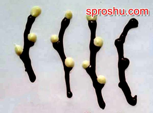 Потом по тому же принципу из белого шоколада нарисуйте вербовые котики, не снимая шоколад с файла.