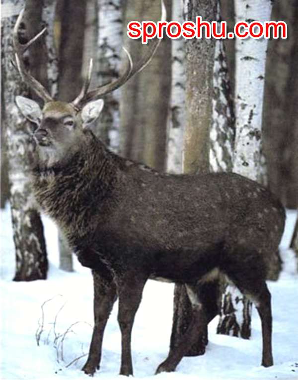 Голова оленя более светлого цвета, нежели туловище. Его морда и уши подняты, он внимательно наблюдает за происходящим. Настоящее украшение и гордость пятнистого оленя - его рога. Мощные, ветвистые, с беловатыми кончиками.