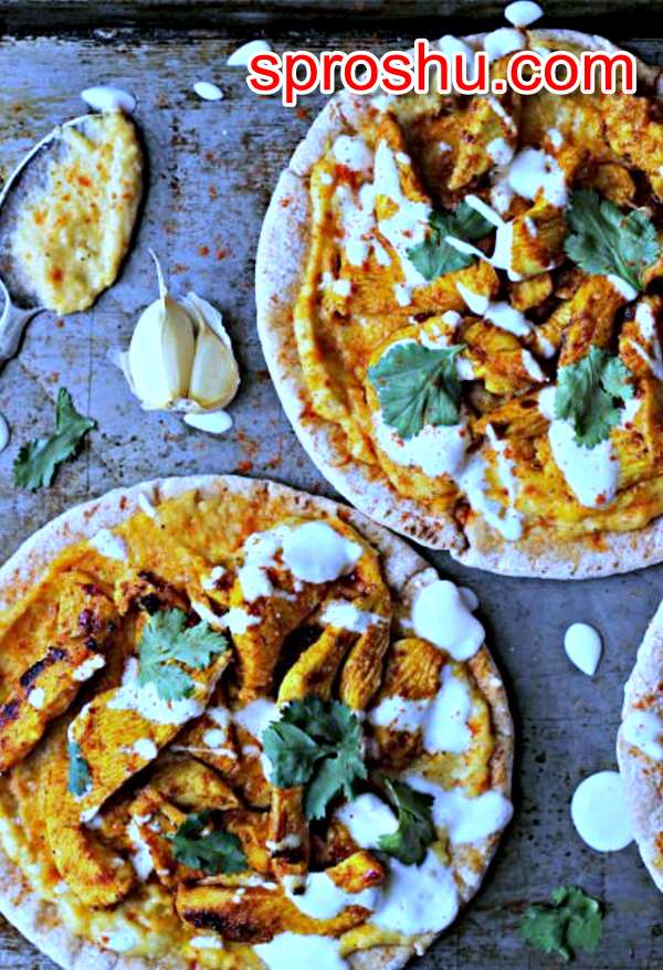 Обжарить курицу в соусе карри с чесноком. Выложить сверху на лаваш. И есть. Можно дополнить еще и сметанным соусом.