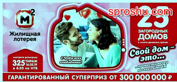 Розыгрыш 325 тиража Жилищной лотереи состоится в субботу 16 февраля 2019 года и будет посвящен Дню влюблённых. В связи с этим праздником и слоган тиража - "Свой дом это... провести вечер только вдвоём". В 325 тираже будет разыграно 25 загородных домов, гарантированный суперприз в размере 300 миллионов рублей и множество других денежных призов.