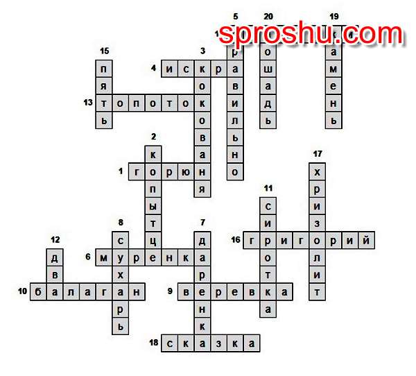 Ответы: 1 - горюн, 2 - копытце, 3 - Кокованя, 4 - искра, 5 - правильно, 6 - Муренка, 7 - Даренка, 8 - сухарь, 9 - веревка, 10 - балаган, 11 - сиротка, 12 - два, 13 - топоток, 14 - полшапки, 15 - пять, 16 - Григорий, 17 - хризолит, 18 - сказка, 19 - камень, 20 - лошадь.