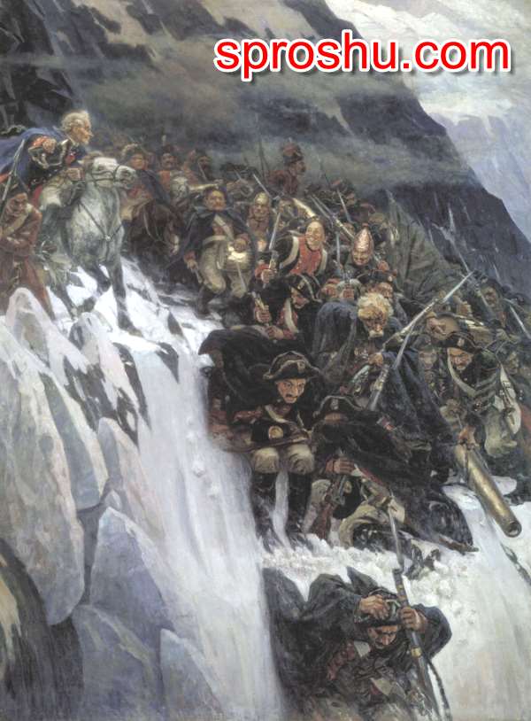 Русский живописец, создававший шедевры на исторические темы Василий Суриков написал знаменитое полотно "Переход Суворова через Альпы".