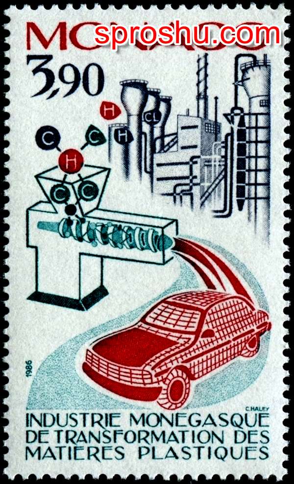 В нижней части этой почтовой марки написано по-французски: "Промышленность Монако. Переработка пластических масс". Художник изобразил, как пластмассы перерабатываются в некоей "мясорубке" и используются, очевидно, для производства деталей автомобилей. Такой "примитивчик" художнику еще можно было бы простить. Но вот то, что он создал из символов химических элементов, непростительно. Видимо, в Монако не нашлось химика, знающего химию в пределах программы девяти классов российских школ. На фоне какого-то химического завода нарисованы изолированные атомы водорода и хлора. А в "мясорубку" поступает совсем уж несуразное: молекула, один из еще "не переработанного" фрагмента, который состоит из четырехвалентного(!) атома водорода, соединенного с четырьмя атомами углерода. Если в центр поместить атом углерода, а другие атомы С заменить на атомы Н, получится молекула метана СН4, но не получится "продолжить" молекулу в шнек для ее "переработки".