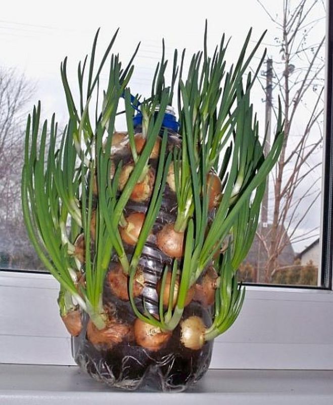 Есть разные способы посадки лука. Его луковицы высаживают в ячейки из-под яиц, в мелкую плоскую посуду, быстро истощается почва, мало питания. Сажают в горшки и более глубокие емкости. Высаживают в пятилитровые бутылки, наполненные почвой вертикально.
