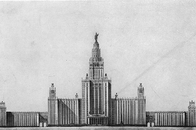 Здание МГУ построено в 1949-1953 годах. Первоначальный проект выглядел так: