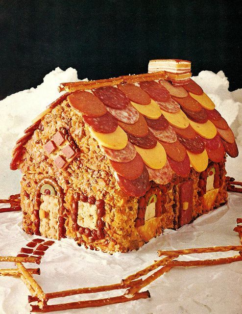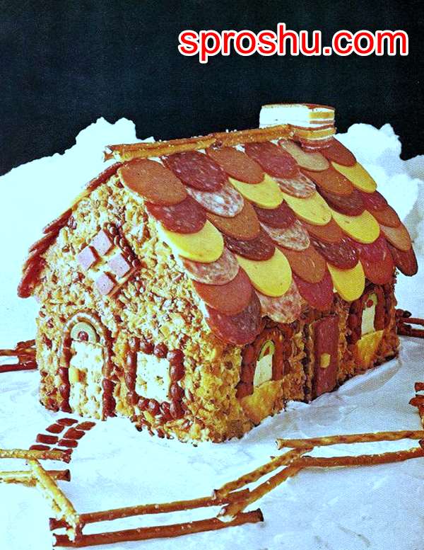Строится дом из пряников и крыша делается из салями и сыра. И стены можно обмазать сливочным сыром.