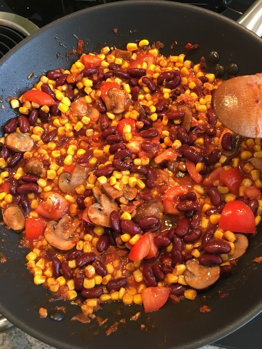 Можно взять несколько видов фасоли разного цвета ( хотя можно и одного) и потушить фасоль с грибами на растительном масле со специями.
