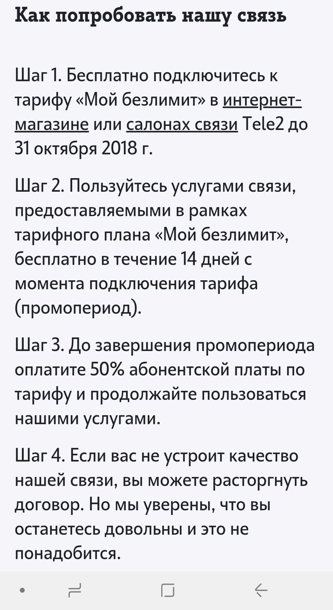 Прогрессивная связь "Теле 2" всё время новшества для привлечения новых абонентов, на этот раз оператор предоставляет пробный период пользования связи в течении 14 дней. В пакет входит минуты связи и интернет, по окончанию пробного периода можно либо отказаться от услуг оператора, либо оплатить 50% абонентской платы и пользоваться связью дальше. Данная акция проводится с 1 по 31 октября 2018 г. Подключиться можно в салонах связи Tele2. Данная акция проходит на территории региона Москва и Московская область.
