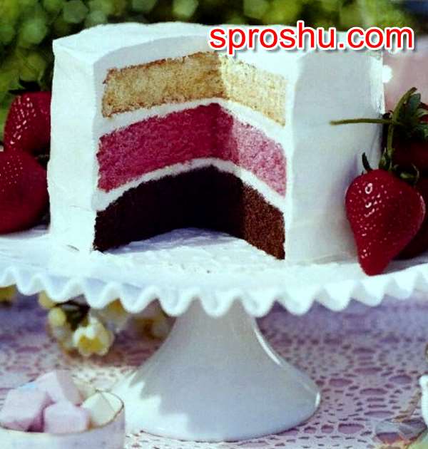 Предлагаю вот такой самый лёгкий рецепт этого торта. Легче рецепта не бывает. Для приготовления будут нужны восемь яиц, двести грамм сахарного песка, сто восемьдесят грамм муки, две чайных ложки разрыхлителя, двести грамм размягчённого сливочного масла, две столовых ложки какао в порошке, треть чайной ложки пищевой краски розового цвета, пятьсот грамм сливочного сыра, два стакана сахарной пудры, свежие ягоды клубники.