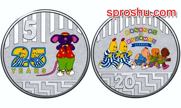 В 1992 году в Австралии был снят мультфильм "Бананы в пижаме". Затем как продолжение был снят сериал, всего 6 сезонов, с 1992 по 2001 год. Спустя 25 лет к юбилею выхода мультфильма на экраны, были выпущены памятные монеты. Всего в 2017 году выпустили 2 монеты достоинством 20 и 5 центов из медно-никелевого сплава, диаметр 28,5 и 19,4 мм. На них были изображены в цвете герои этого мультфильма. На оборотной стороне изображена королева Елизавета II и указан год выпуска - 2017. Тираж монет 30 000 экземпляров.