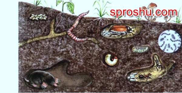 К таким животным относятся черви и личинки различных насекомых, которые почву перемешивают и выносят её на поверхность земли, что дает почве обогащению различными неорганическими веществами. Дождевыми червями, которые пропускают почву через свой кишечник, почва насыщается кальцием и азотом, чем улучшаются физические и химические её свойства.